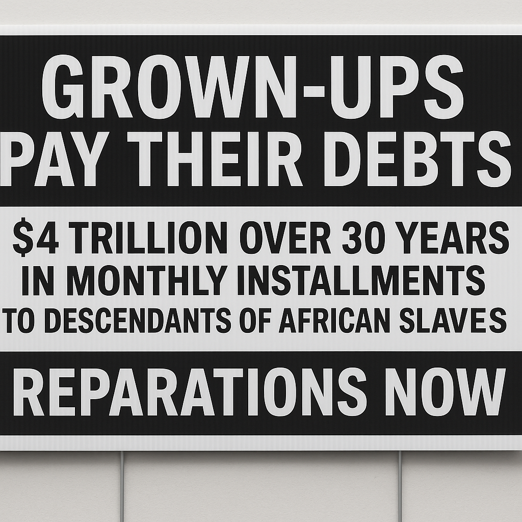 “Grown-Ups Pay Their Debts: $4 Trillion Over 30 Years in Monthly Installments to Descendants of African Slaves. Reparations Now.”