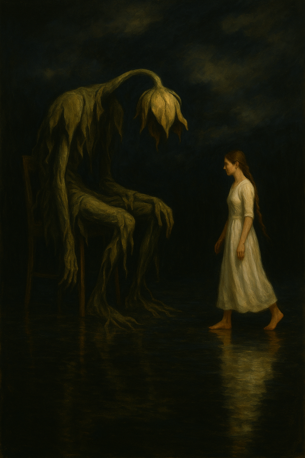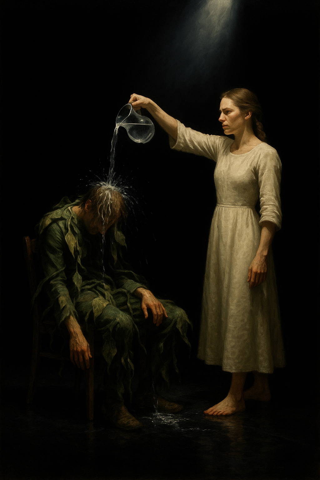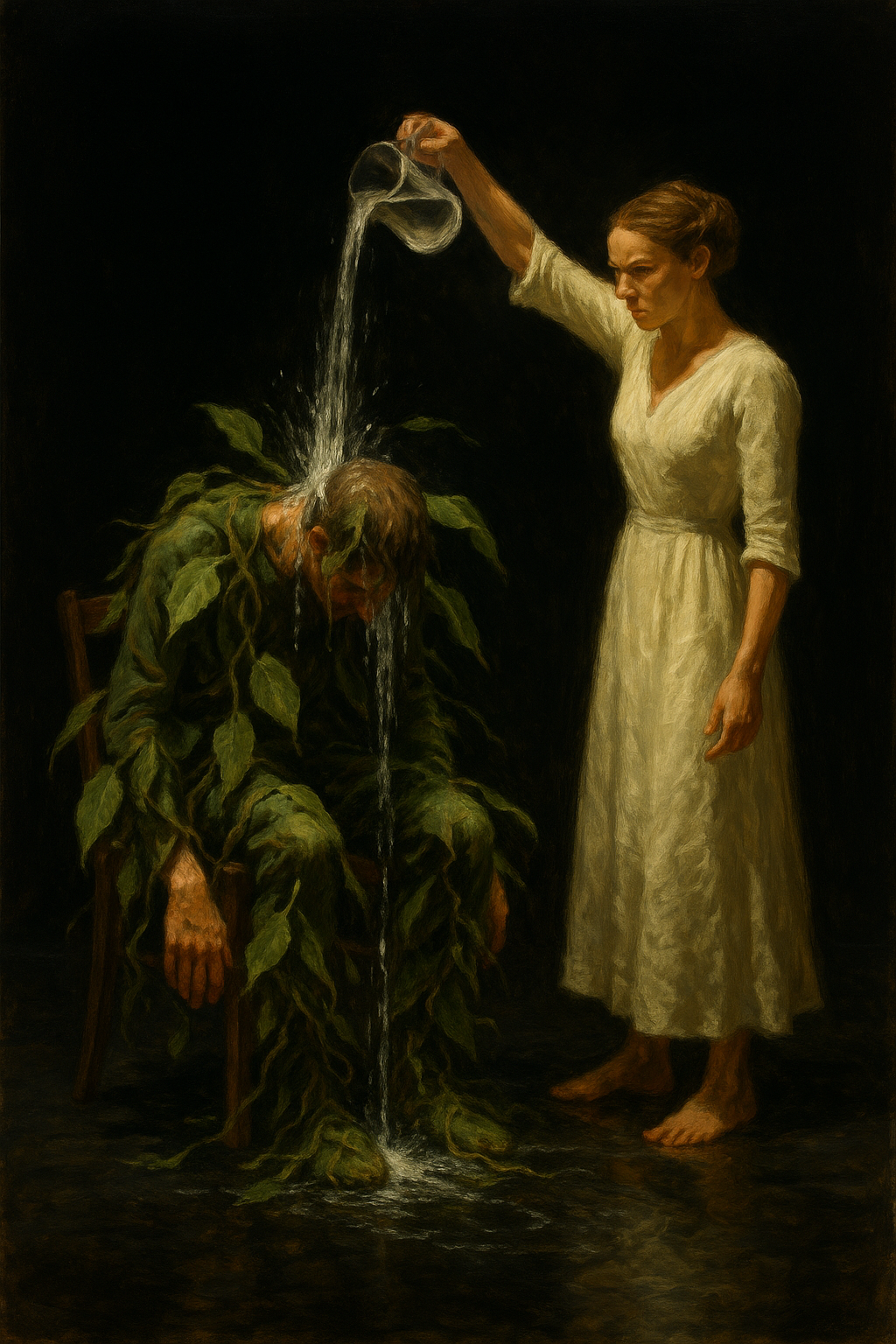 Scene: Bare stage. A low stool (the “pot”). A small table with a glass pitcher of water. The PLANT slumps center. The WOMAN circles.