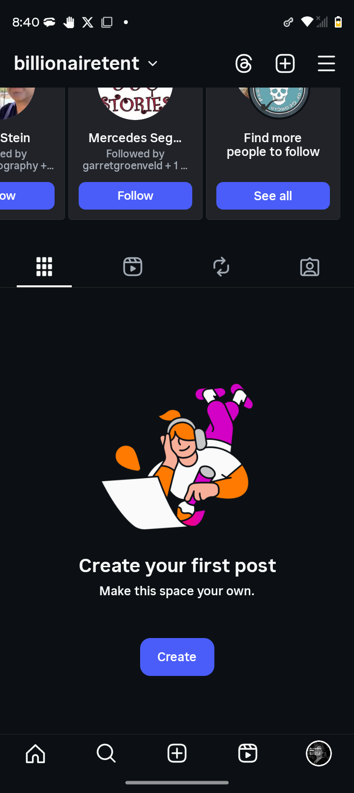 My grid shows zero posts.